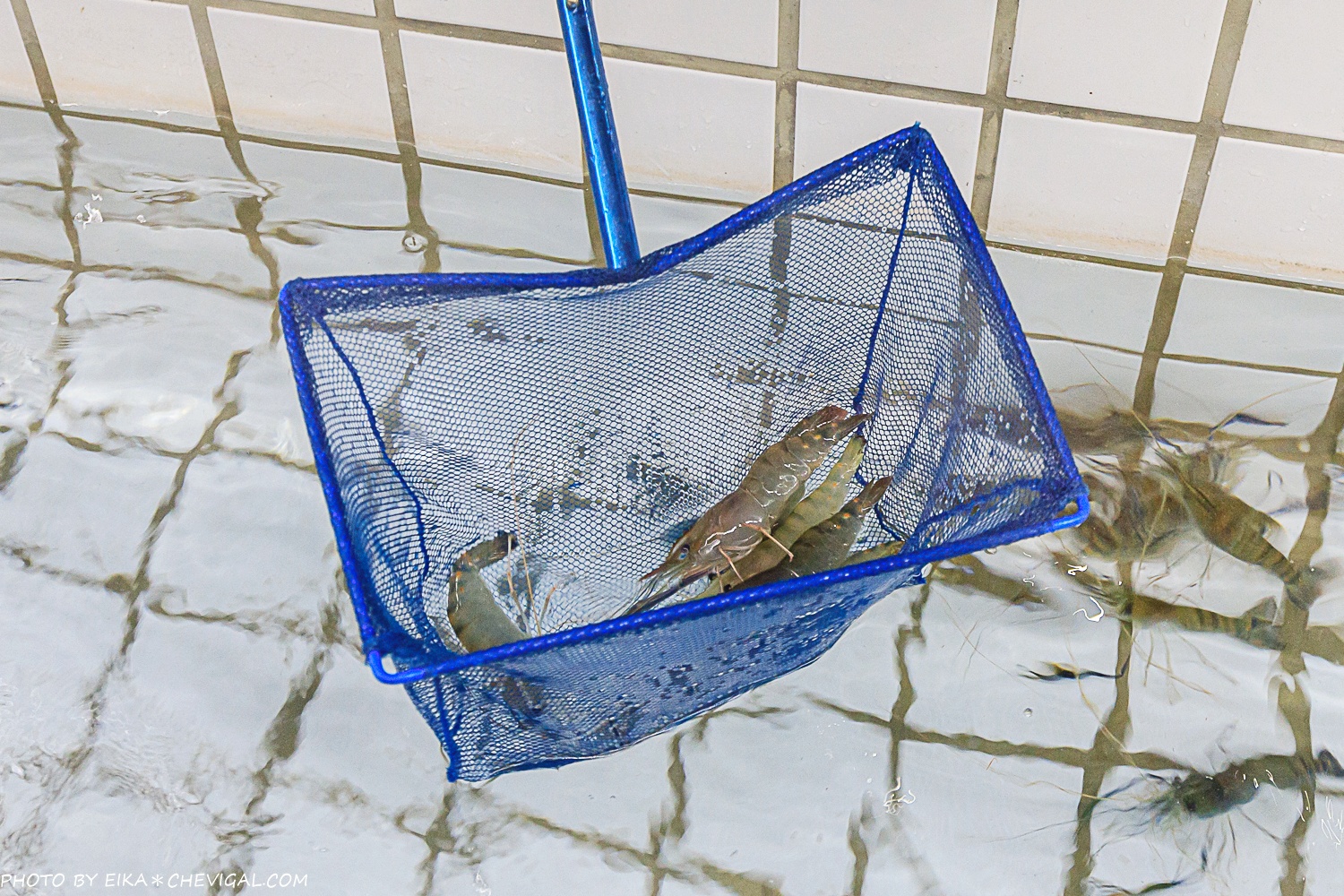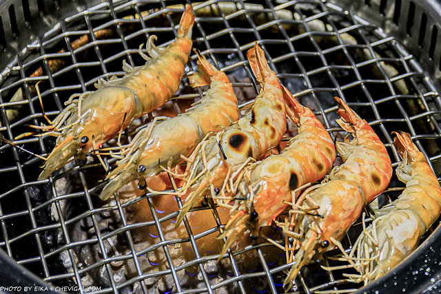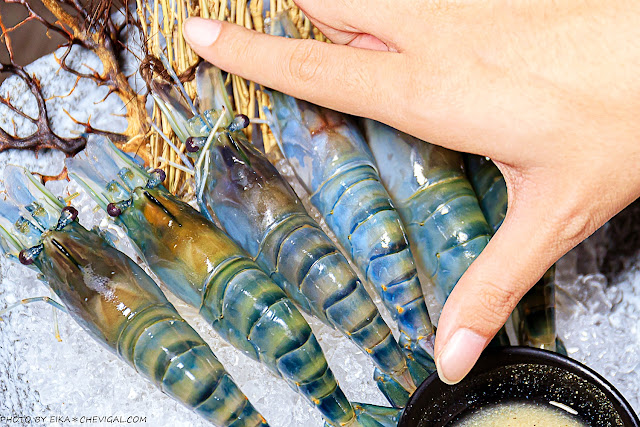 更酷的是自助吧底下就能看到大型水族箱,裡面有多隻活跳跳的新鮮泰國蝦,全部都是現點現撈,幫客人送上桌之前還會先將蝦子凍暈,上桌就能直接開烤囉!