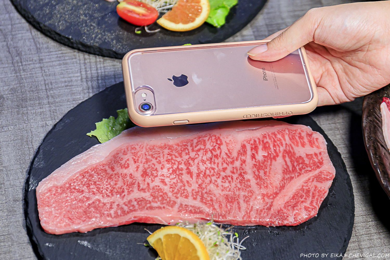 這塊紐約客不僅是原塊肉,光是拿魚編的iPhone7和牛排比一比,就知道真的不小片!分切的肉質厚度非常適合燒烤,建議烤至五至七分熟的熟度最為剛好。