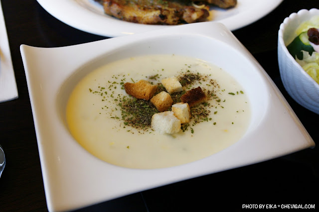 當日濃湯是以培根、奶油、洋蔥、鮮奶、鮮奶油等食材熬煮而成,喝來奶香味濃郁,洋蔥的鮮甜在口中綻放,甘醇而馥郁,難怪特別深受客人喜愛。