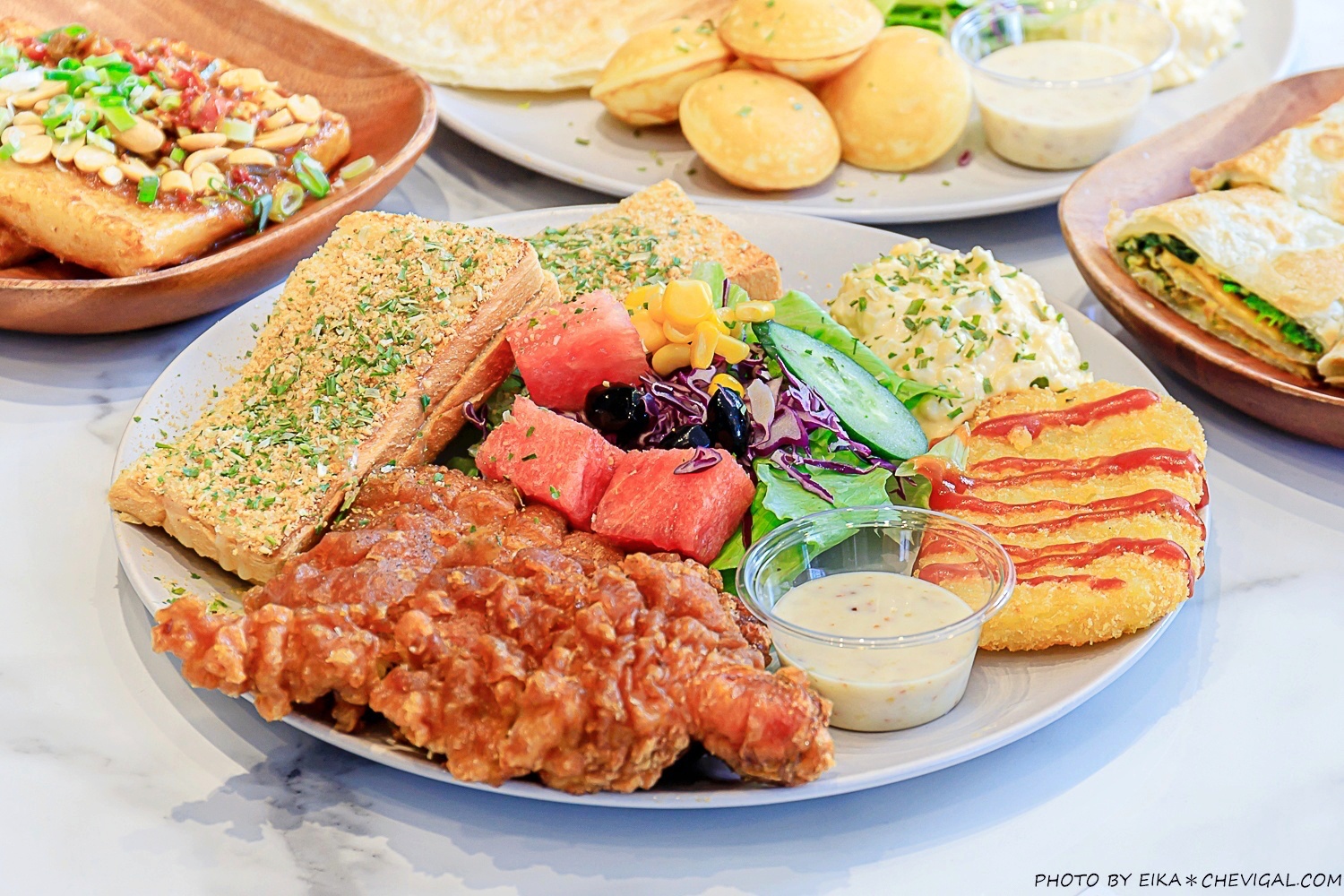 花生大力士雞腿拼盤$168元,這道拼盤從去年推出以來就受到不少客人好評,整份含有生菜沙拉、洋芋蛋沙拉、薯餅、花生土司與浩克雞腿排,一早就能吃飽飽!
