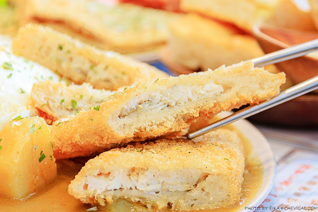 雙飛鏢魚排咖哩飯,整份咖哩飯的份量頗有誠意,兩大塊飛鏢魚排、半熟蛋與紮實的白飯,再加上滿滿的咖哩醬,小鳥胃的魚編實在吃不完,多到真的要打包XD