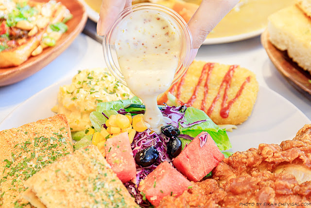 生菜沙拉可以淋上隨盤附上的農場醬,雖然有點類似蜂蜜芥末醬,但是酸甜香氣比較柔和不刺激,算是還蠻開胃的!