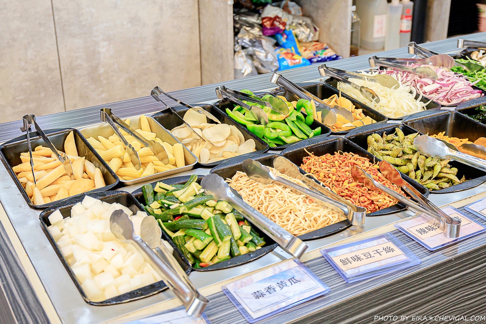 吧台另一側有各式小菜可以取用,像是百香南瓜、蒜香黃瓜、鮮味豆干條、辣味黃荳芽、白玉蘿蔔、椒鹽毛豆、韓式海帶芽、青龍、鑫鑫腸等等,想吃多少就夾多少。