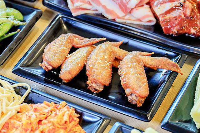大醬豬五花與紐澳良雞翅,大醬可以說是韓國相當常見的醬料之一,吃起來的風味像是日式味噌醬與中式豆瓣醬的綜合版,甜甜的口味還不錯吃。