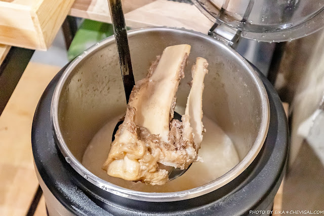 雖然豚骨湯是免費取用的,不過用料倒是一點也不馬虎,撈起湯底還能看到超大根的豬骨!溫潤濃郁的乳白色湯頭表面飄著些許油花,卻不會覺得膩口,熱熱地喝起來特別暖心。