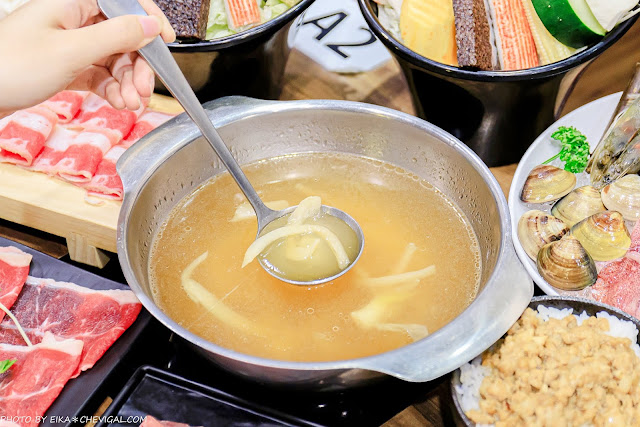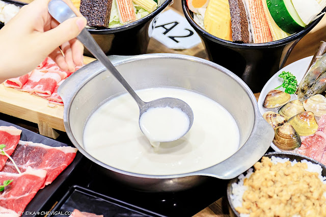 濃厚起司牛奶鍋$70元,這款湯頭需要另外加價,但卻也是不少客人必點的招牌;上桌時記得先將鍋內的起司片攪拌開來,喝起來滑順清爽,牛奶的甜香與起司的鹹香交織在一起,我們覺得搭配豬肉還不錯。
