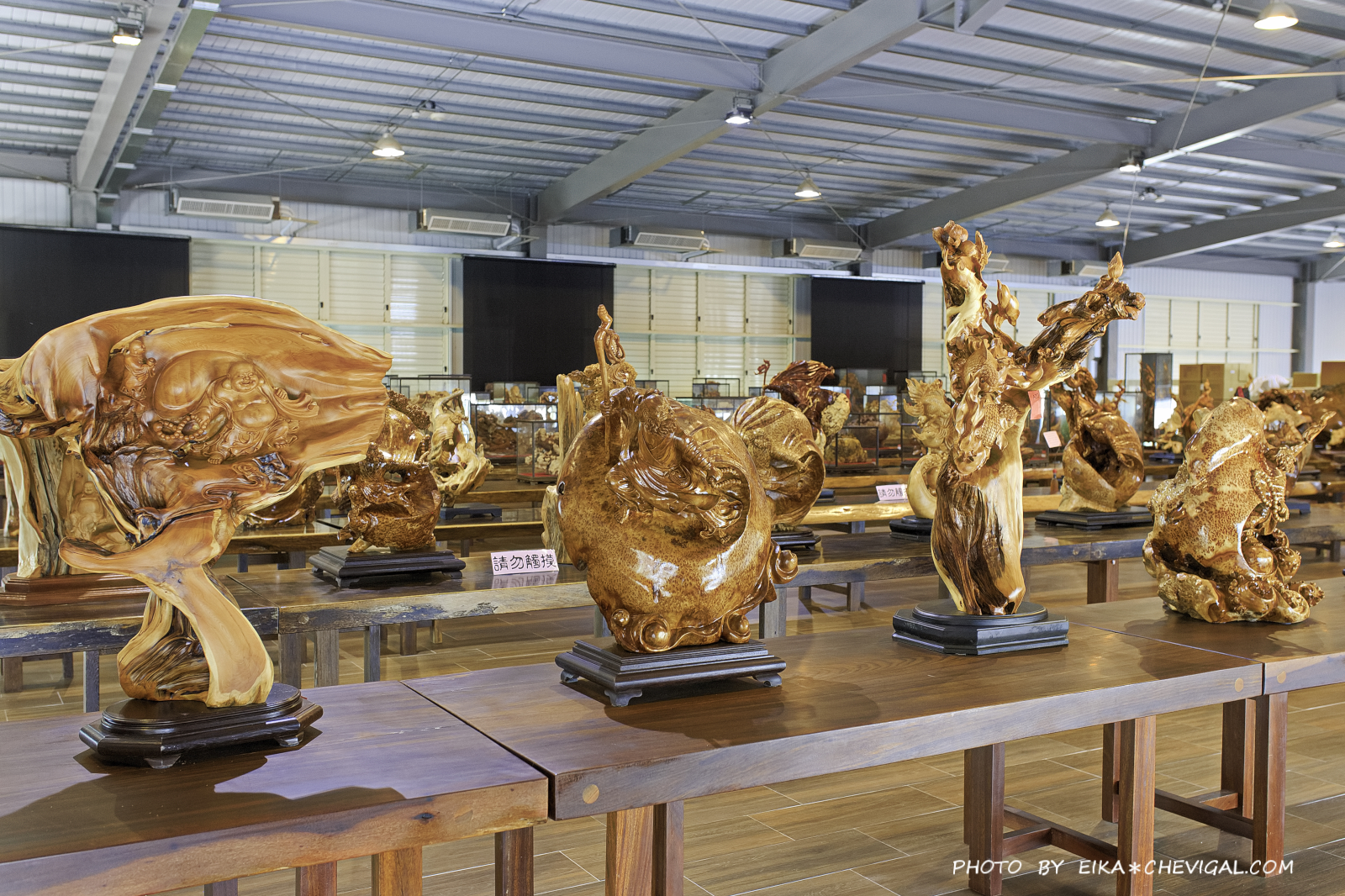 整個空間充滿了木質的芬芳氣味,有著紅豆杉、崖柏、香柏等多種樹種的作品,讓人看得目不轉睛。有部份的木雕作品也有提供販售,有興趣的同好不妨可以來到這裡交流一下。