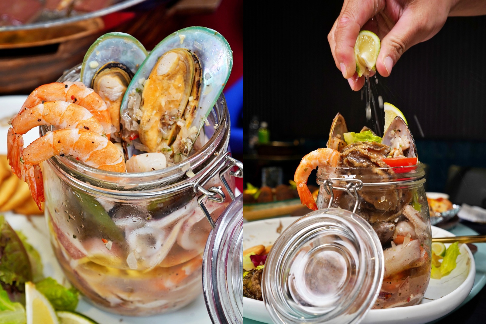 隨盤還有搭配一份義式油封海鮮罐,吃得到以橄欖油漬花枝、淡菜與鮮蝦,擠上新鮮檸檬汁更能襯托出鮮美海味。