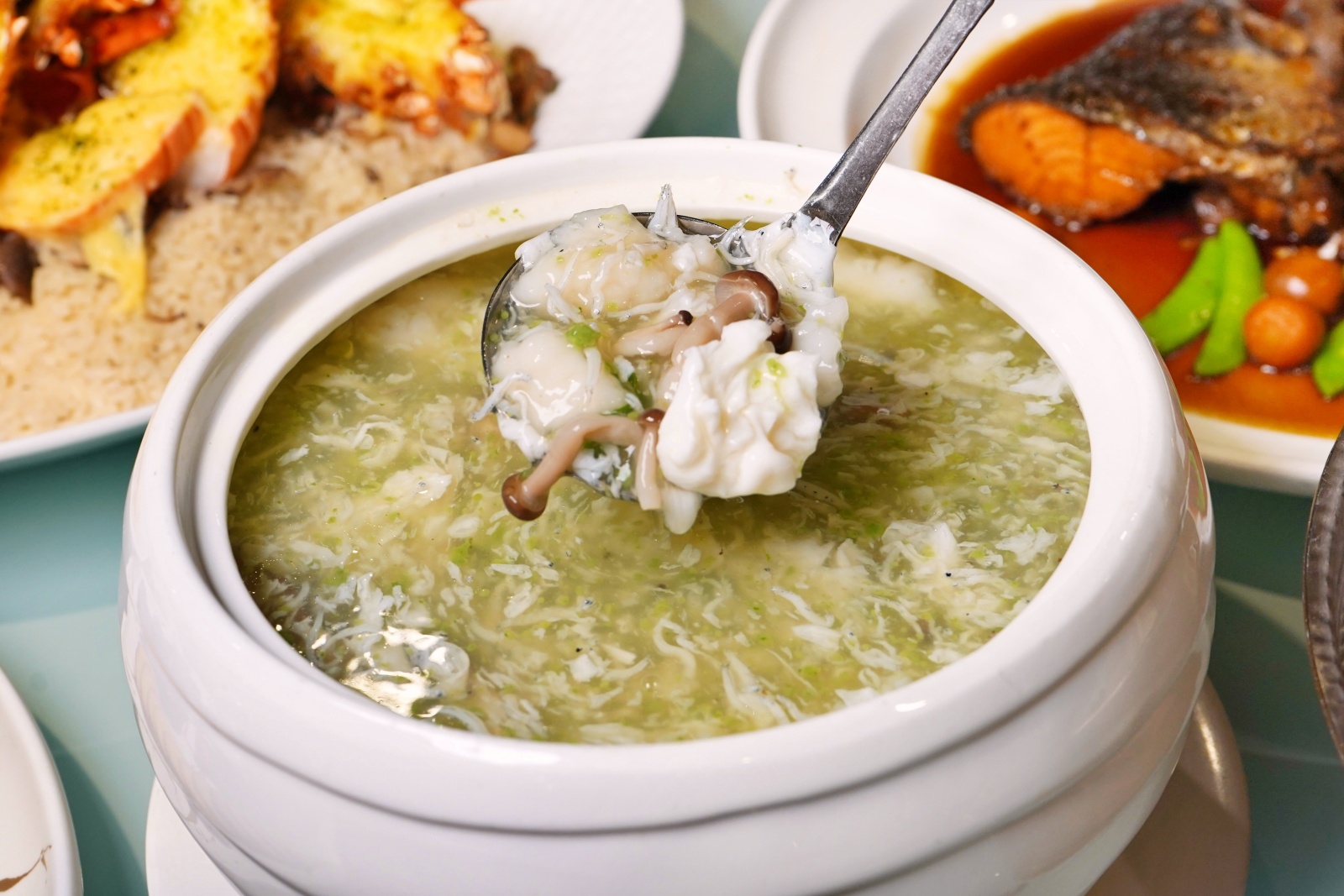 用料超有誠意的翡翠干貝銀魚羹,入口溫潤濃郁,以高湯作為基底,結合甘甜干貝、鮮香銀魚,再以翠綠菠菜泥點綴,特別暖胃好喝,魚編自己就喝了好幾碗。