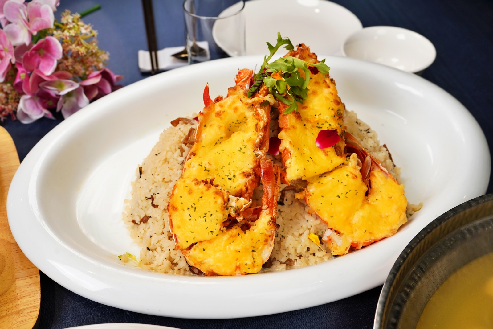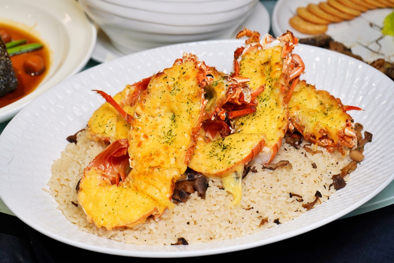 奢華的龍蝦蕈菇燉飯也是一出場就吸引了整桌的目光,以新鮮龍蝦搭配奶香蕈菇燉飯,龍蝦鋪上起司焗烤至金黃,彈牙的鮮美肉質與起司奶香交織在一起。