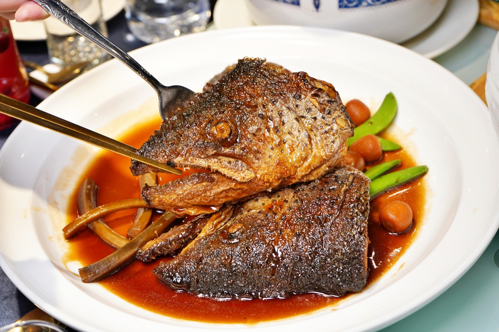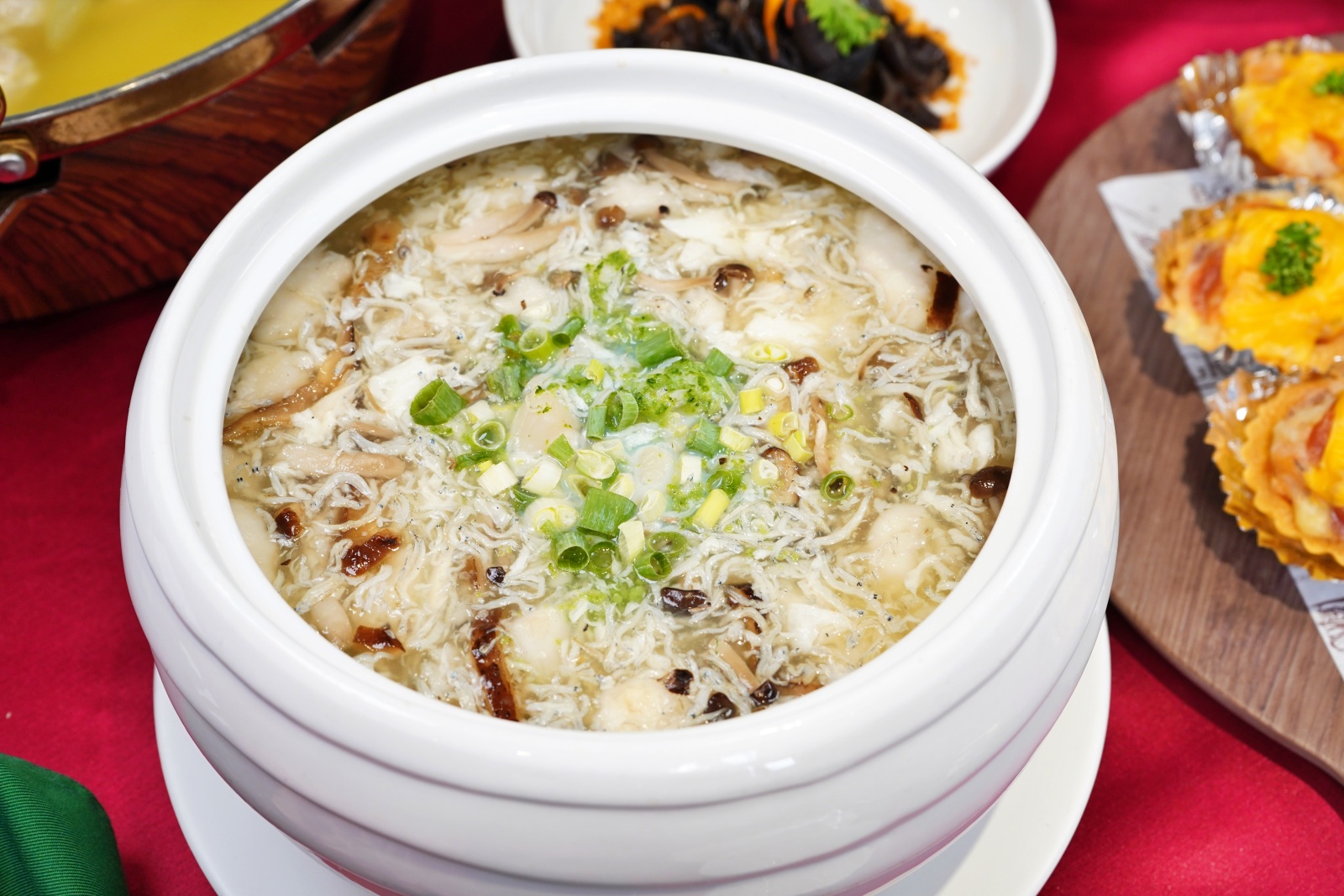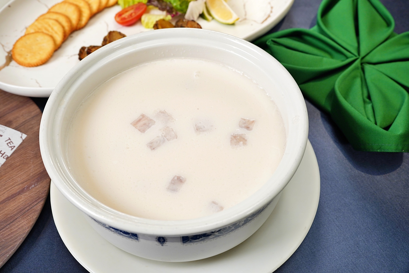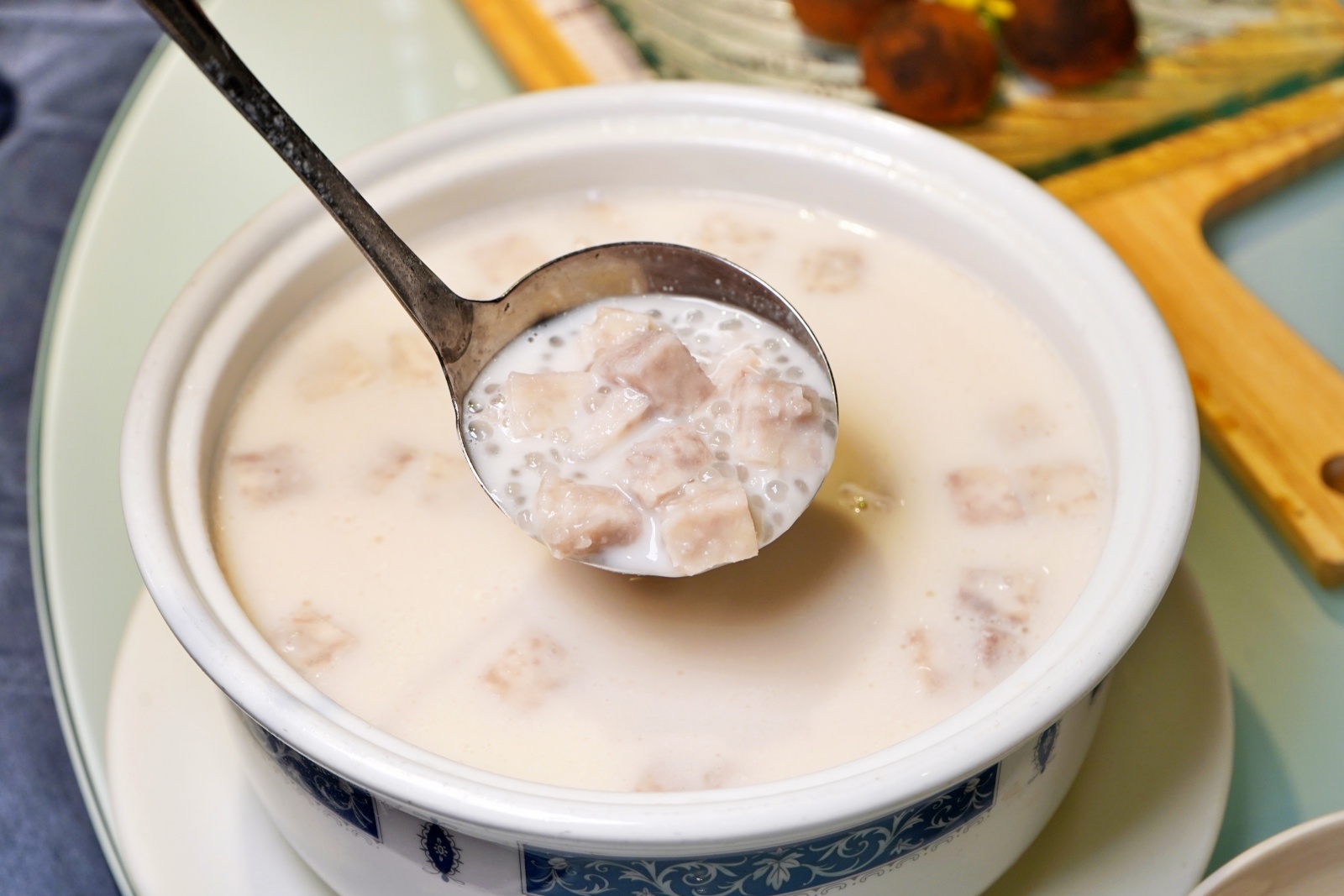 最後端上的是溫熱的芋頭西米露,椰香西米露結合慢火熬煮的香濃芋頭,喝起來滑順潤口、甜而不膩,為整套經典桌菜劃下最暖心的句點。