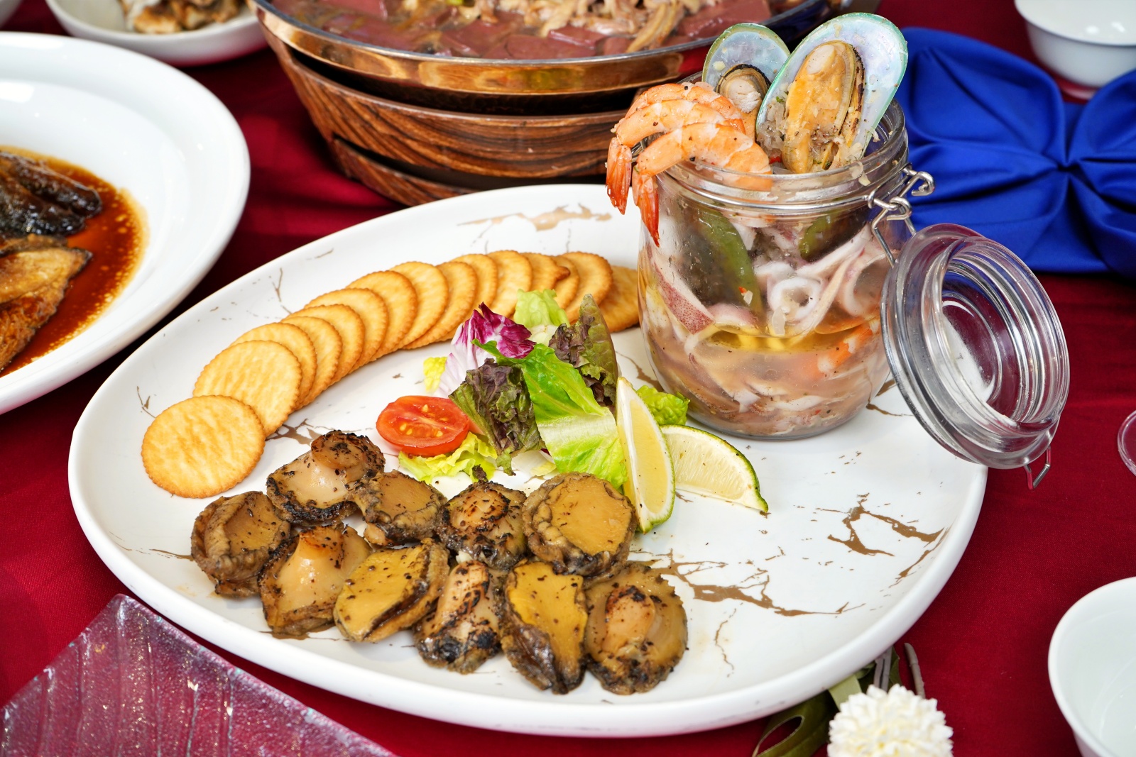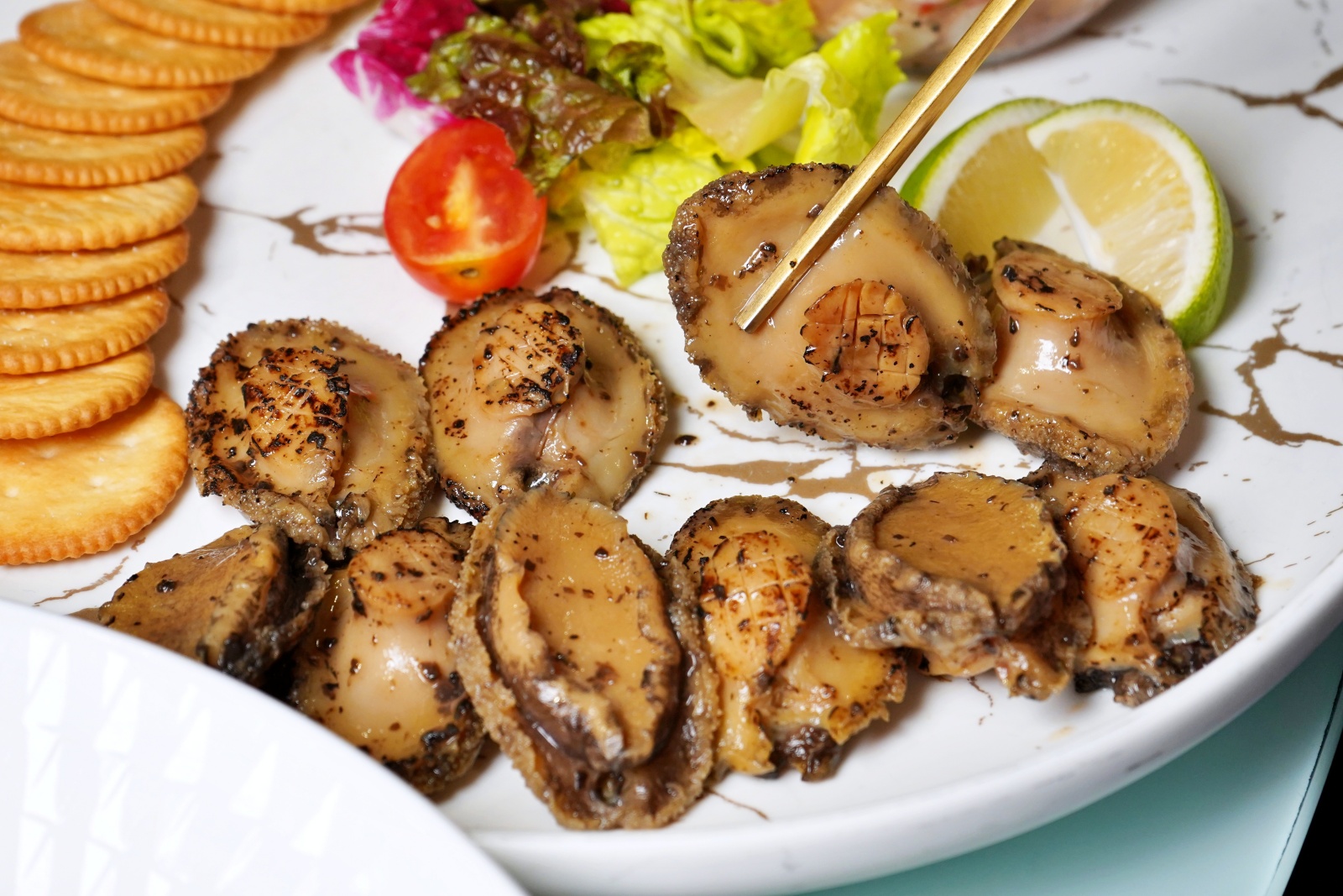 擺盤大氣的松露鮑魚佐油漬海鮮,特別嚴選厚實鮑魚低溫慢煮,嫩Q彈牙的口感伴隨著迷人松露香氣好奢華!
