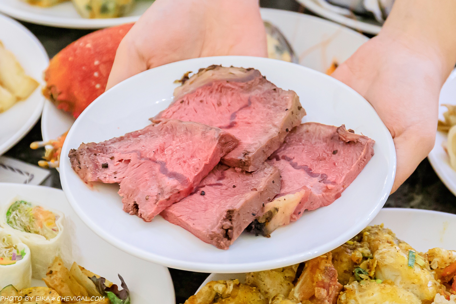現切爐烤香料牛肉的色澤粉嫩,肉質厚度有誠意,吃起來也不會太柴澀;可以先品嚐牛肉的原始風味,再搭配其他沾醬調味,像我們覺得紅酒醬的味道還不錯,肉香之中還帶點果香的微酸與發酵的甜味。
