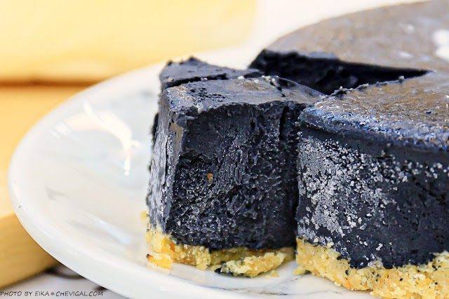極黑重乳酪 $180元,店家採用竹炭粉與黑芝麻醬,搭配底下的奇福餅乾製成這款重乳酪蛋糕,老實說黑芝麻口味的重乳酪並不少見,不過黑的這麼徹底的,我們還是第一次見到啊XD