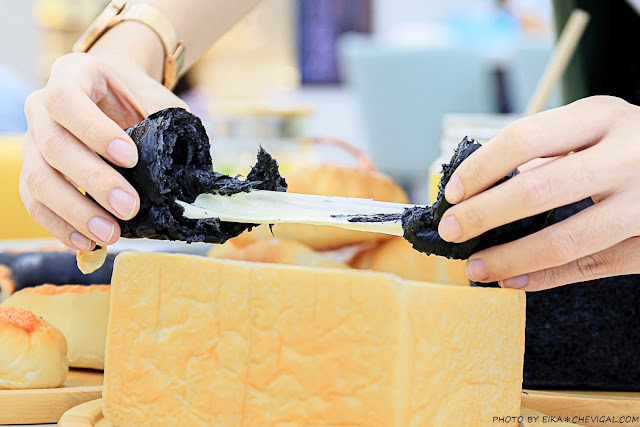 既然加入莫札瑞拉起司,不免俗要跟風拉絲一下XD 可以發現裡面的起司份量很有誠意,據說有客人拉超過1.5公尺呢!鹽可頌外皮的酥脆與麵包體的鬆軟,搭配上起司的彈性,口感的層次表現非常豐富;淡雅的竹炭香與起司的奶香,讓整體的風味呈現不同的厚度。