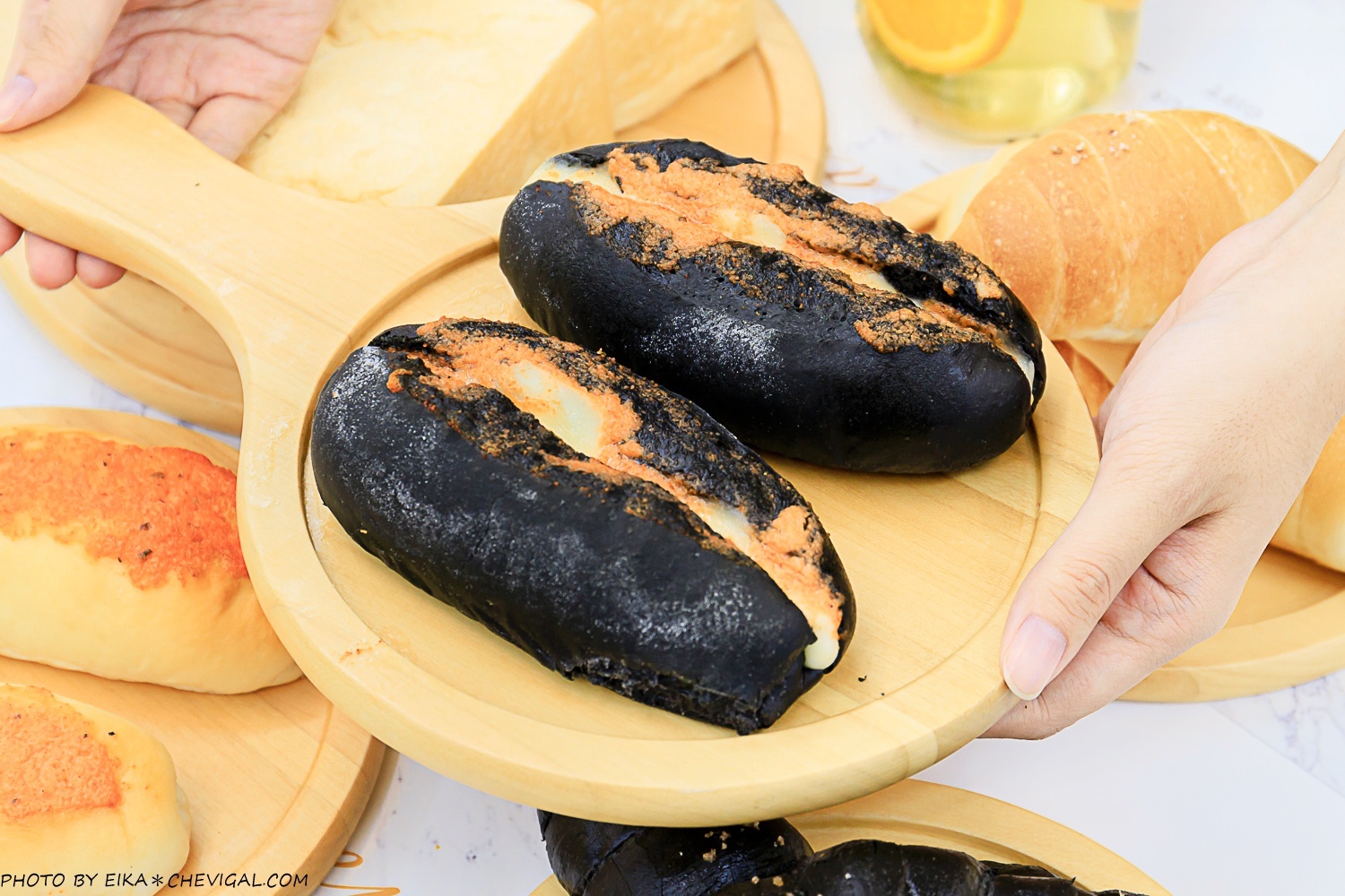 店家是用湯種軟法,口感鬆濕潤鬆軟,不過加入竹炭粉後,吃起來會變得比較有韌性一點;莫札瑞拉起司與明太子本身都具有鹹度,吃起來的口味比較重,搭配飲料還不錯!