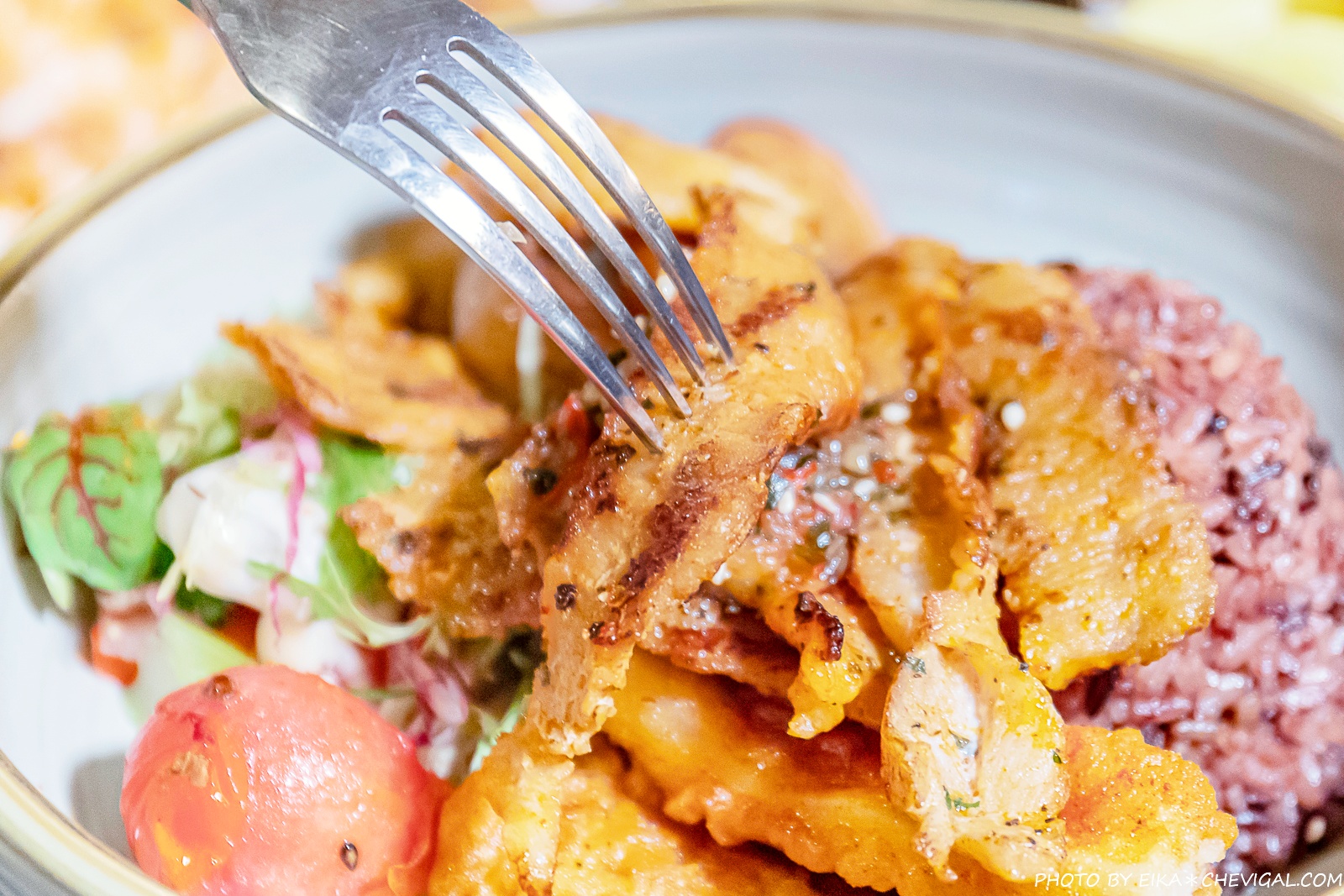 這天點的是彩鹽燻松阪豬,與前面香氣逼人的炒黑麻油松阪豬又是完全不同的風味和口感;鹽燻使得松阪豬多了幾分鹹香層次,口感也更加脆彈耐嚼。裡面還有各式生菜、時蔬與紫米飯,單吃其實就還蠻飽的了!