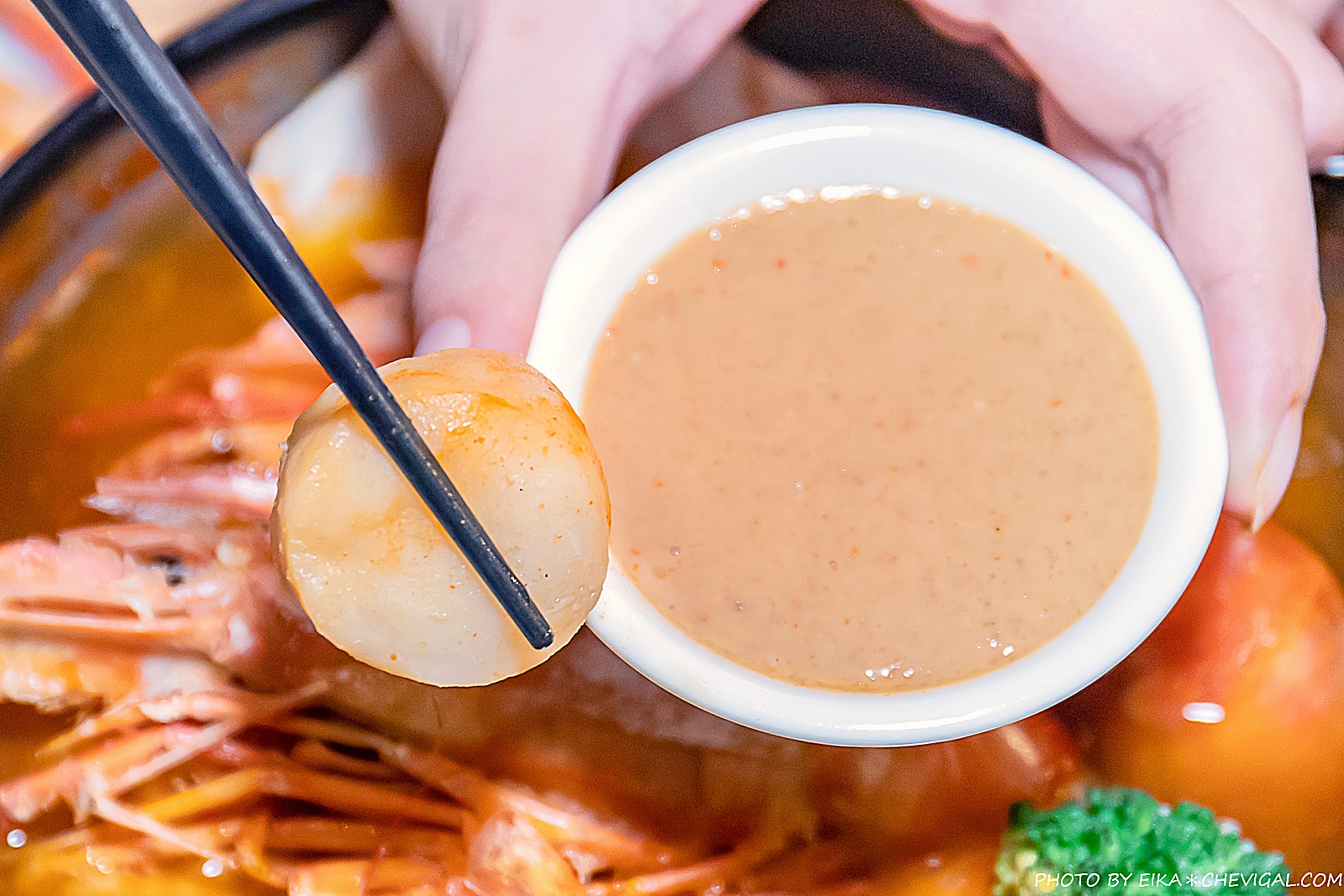 除了個頭超大隻的天使紅蝦之外,裡面竟然還吃得到扇貝與貝柱,果然都是普通個人小火鍋比較難享用到的海鮮種類,還能依照個人喜好搭配隨盤附上的泡菜與沾醬哦!