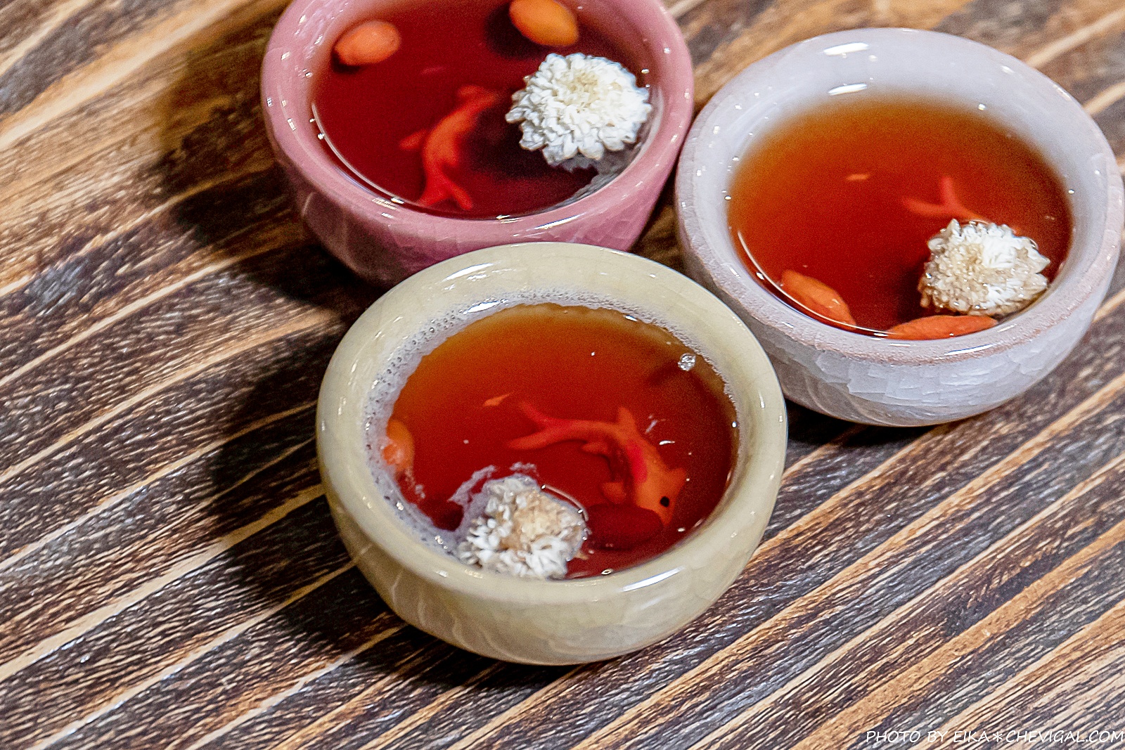 入座不久就會幫每人送上一小杯招牌的枸杞菊花老紅茶,風味溫潤清甜,而且喝到底部還會看見杯底的鯉魚慢慢浮出水面,連朋友都說好想買個杯子回家自己用~