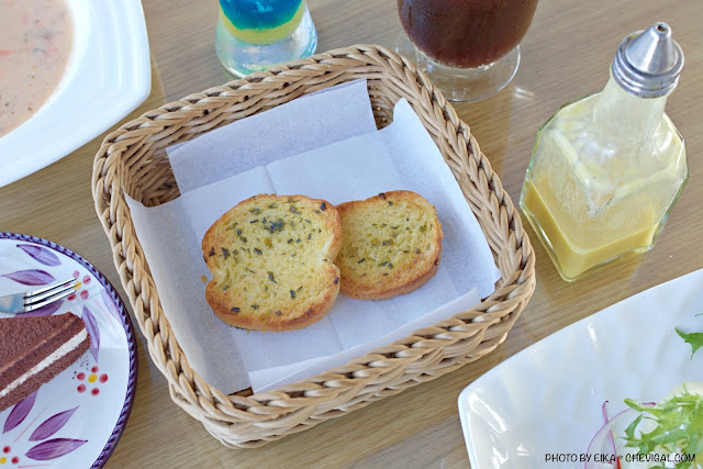 烤麵包的表面塗有香蒜醬,鹹香十分迷人,香香酥酥的口感讓我們忍不住還想再加點。
