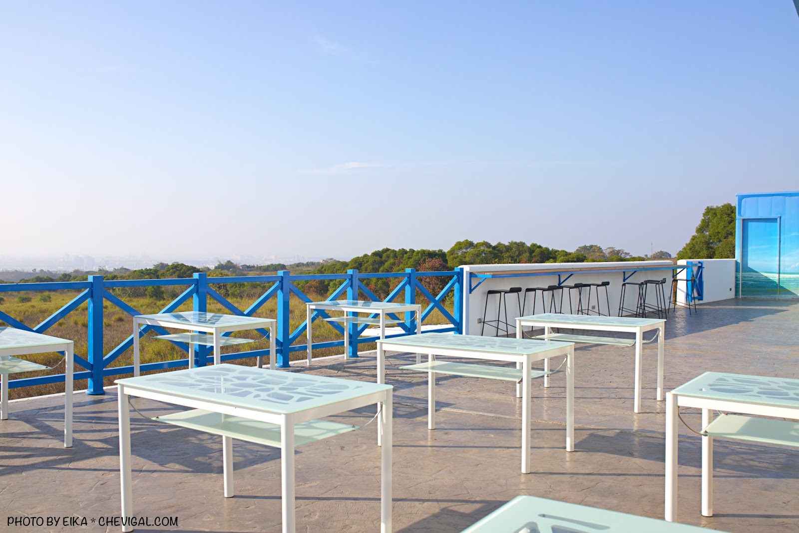 循著樓梯來到二樓,「橄欖愛洋蔥」的外觀除了有著美麗的藍白地中海色調,整體同時也是間玻璃屋的概念,在陽光太強時還會拉起遮陽布簾。