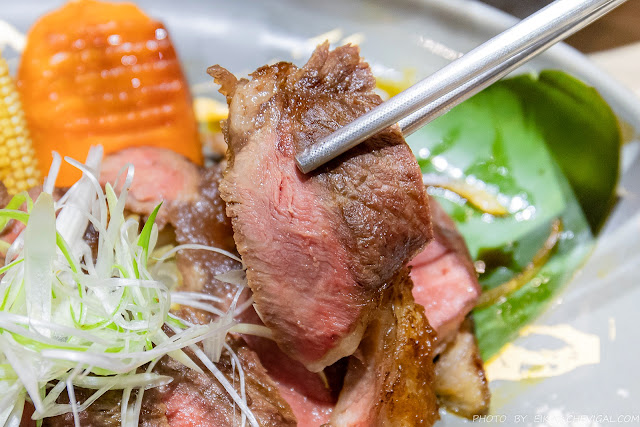 烤過的PRIME冷藏板腱牛肉不僅份量給得相當大方,肉質大約介在五至七分熟之間,粉嫩多汁的色澤看起來就特別誘人!