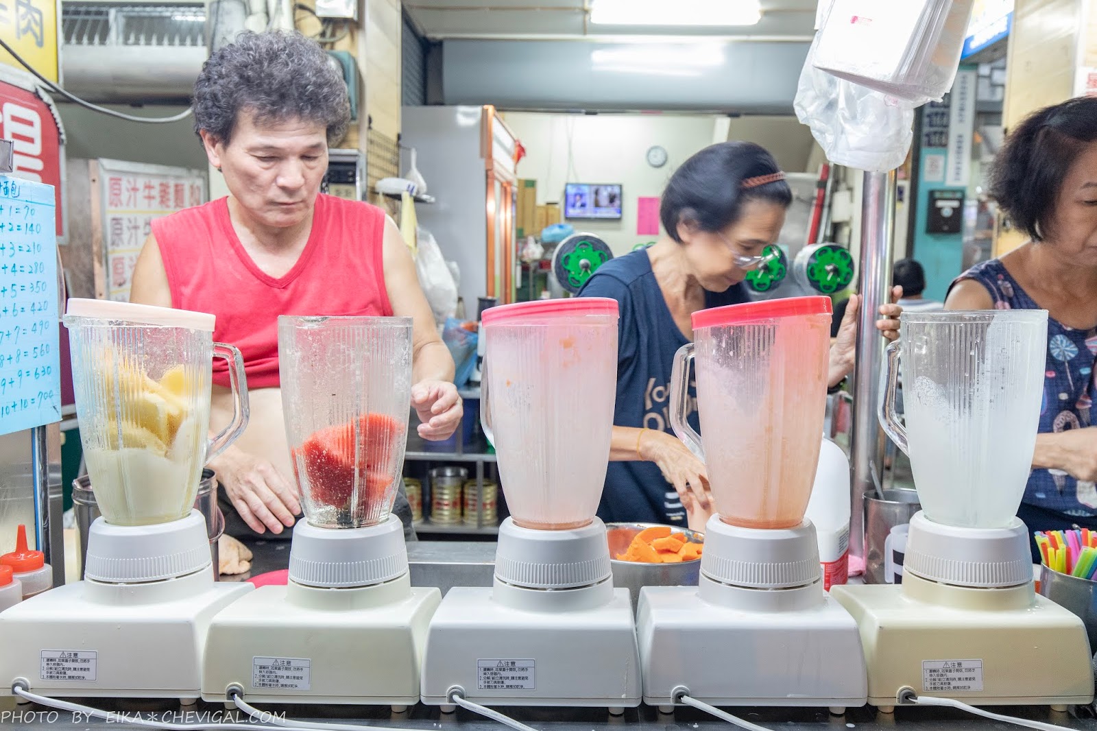 雖然是忠孝夜市的老店,不過生意真的非常好,從攤位上放置了一整排的果汁機看來,就不難想像忙碌的程度。我們在這裡內用半個小時的過程當中,店家的手幾乎從來沒有停下來過。