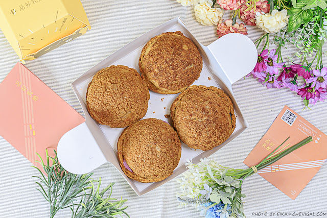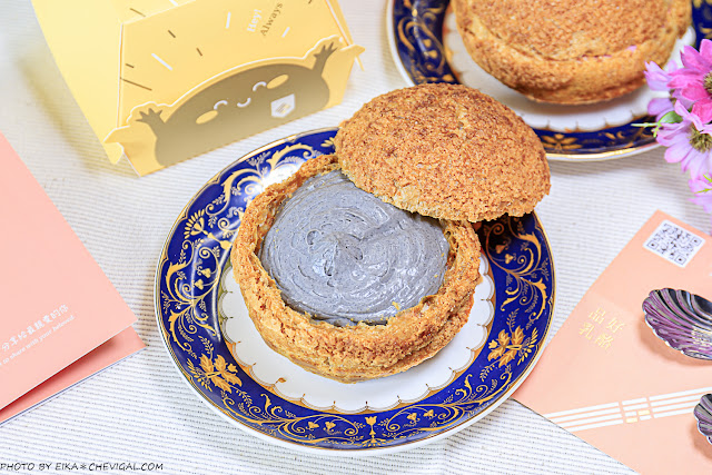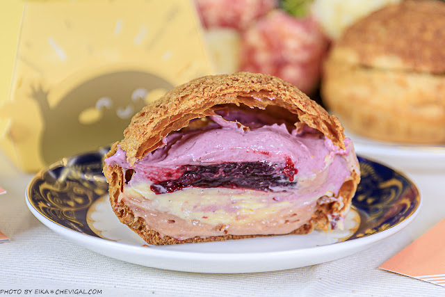 覆盆子莓果$90元,如果是第一次接觸到品好家的乳酪泡芙,不知道該選擇哪種口味,不妨可以試試賣得最好的覆盆子莓果口味!有著薰衣草般的浪漫紫,裡頭更是隱藏著多重餡料~
