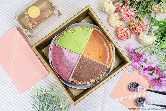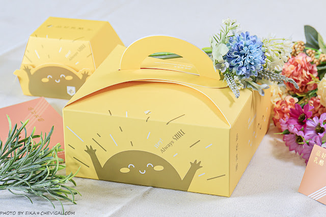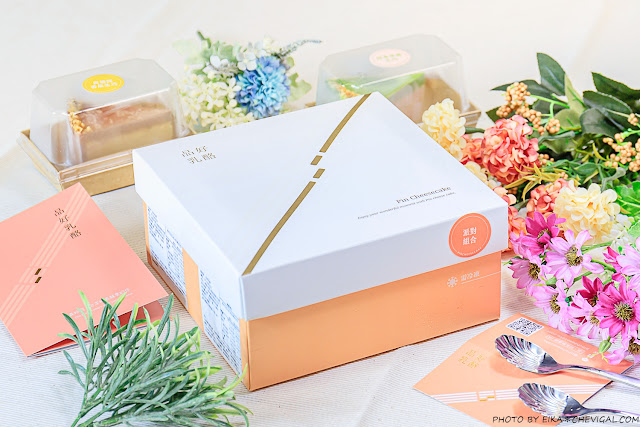 我們這天另外又買了四顆乳酪泡芙與派對組合乳酪蛋糕回家,乳酪泡芙有著鵝黃色的盒裝外觀,搭配上粉紅色的說明小卡與手冊,看起來特別溫柔療癒又有少女心,提盒設計送禮也很大方。