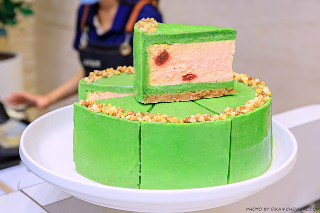 櫃檯旁邊還有一整顆重乳酪蛋糕的等比例模型,就是賣得超好的丸久小山園抹茶草莓生巧乳酪口味,可以讓客人馬上知道實際的大小~而且做得實在很逼真,當天不只我們,不少客人都問說可不可以借摸一下~