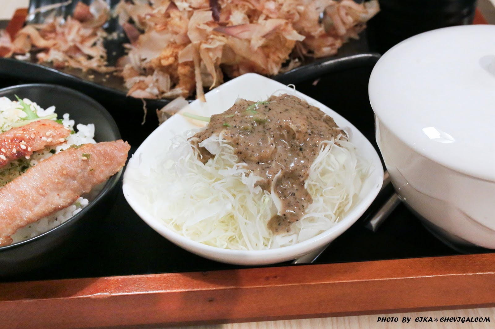 配菜除了高麗菜絲之外,還有鮮菇味噌湯與金針菇茶碗蒸,湯的配料還有豆腐跟海帶,喝起來的味道不會過鹹,茶碗蒸的口感很嫩,除了味道鮮甜之外,調味也很剛好。