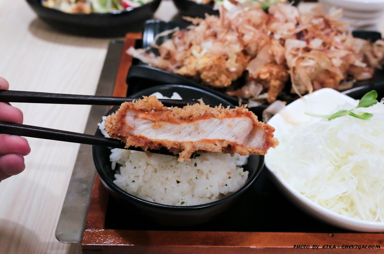 兩公分的厚切豬排真的誇張厚!可以選擇原味或者辣味~不但外觀非常的壯觀,肉質一點也不乾柴喔!金黃酥脆的外皮不只增加香氣,還能讓豬排吃起來的口感更加豐富。