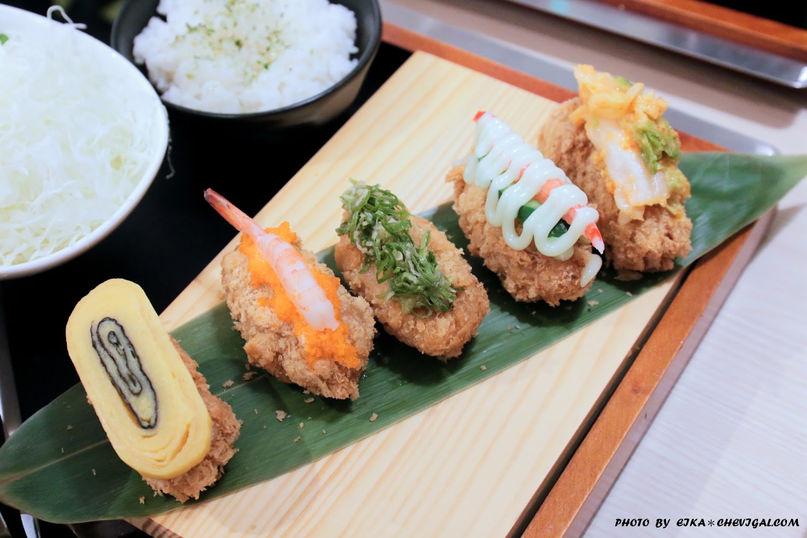 豬排適用軟嫩的腰內肉塑成壽司的形狀,搭配玉子燒、手捲蝦與飛魚卵、蔥鹽、蟹肉棒和最後的黃金泡菜口味,五種不同的味覺饗宴讓這道豬排變得更加豐富,另外建議從玉子燒的部分依序享用,可以得到最佳的味覺體驗喔!