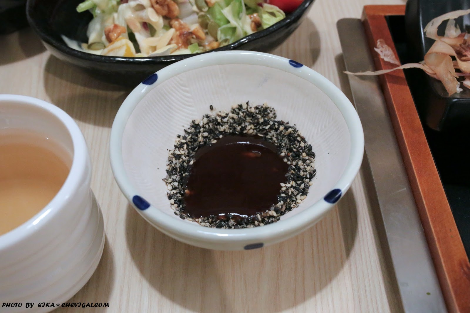 服務人員會建議我們將芝麻搗到約七分碎就好,讓芝麻的香氣顯現出來,同時也保有顆粒感,這樣在沾豬排時口感跟味道都會比較有層次。