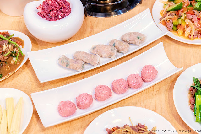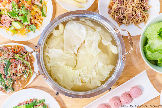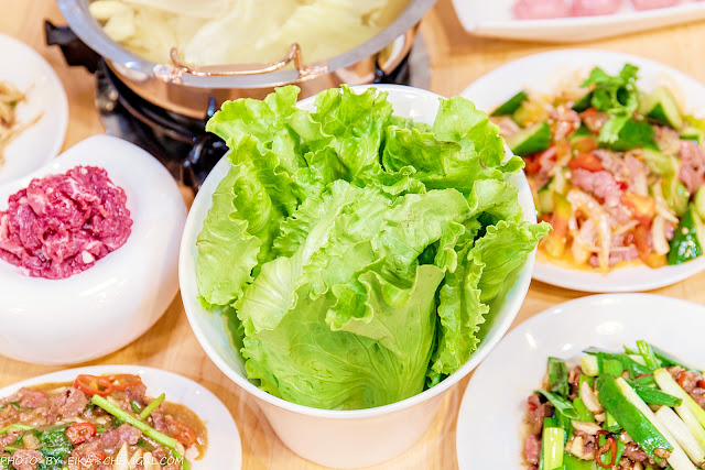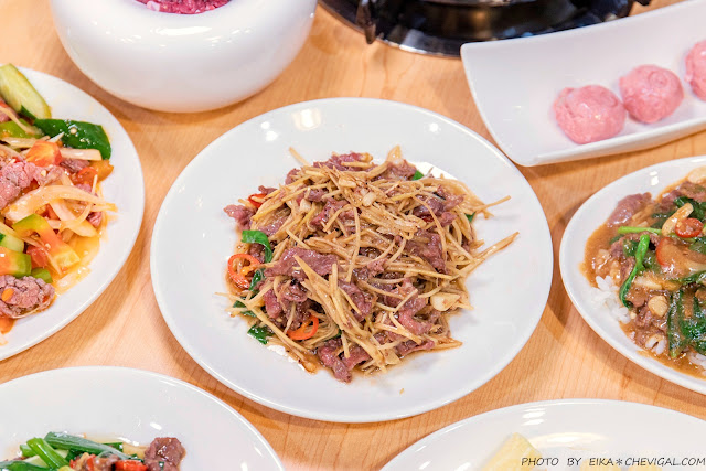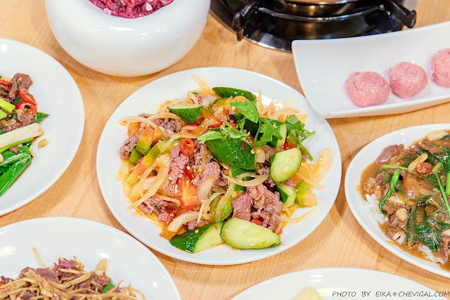涼拌泰式牛肉$250元,我們還是第一次在溫體牛涮涮鍋餐廳內吃到如此特別的冷盤料理,裡面加入了番茄、黃瓜、洋蔥、香菜與泰式醬調味,辣椒籽也不少,吃起來相當爽辣開胃。