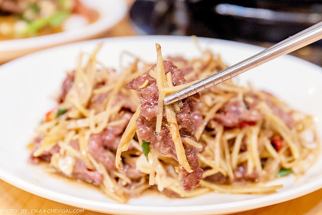 以薑絲去除了牛肉的腥味,吃起來帶點微微的辛辣~而且這道的火候掌握得相當不錯,肉質的口感略有嚼勁,慢慢咀嚼就能帶出迷人肉香;雖然肉汁收得比較乾,但是吃來完全不顯柴澀。