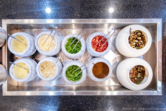 來吃溫體牛涮涮鍋當然少不了醬料與辛香料,想吃多少就加多少~如果懶得自己調配醬料,最右邊還有店家事先調製好的醬料,搭配剛涮好的溫體牛肉更對味!