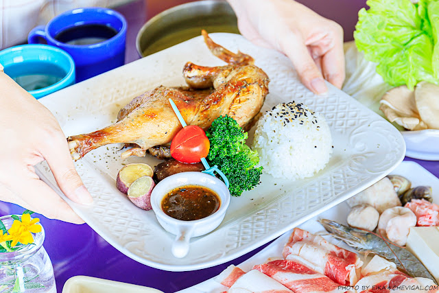 再來就是每桌必點的綠胡椒肉桂烤雞上桌啦!整隻烤雞腿霸氣地佔據了盤面超過3/4的空間,份量完全不小氣~旁邊還附有米飯、蔬果與沾醬,看了特別讓人食指大動!