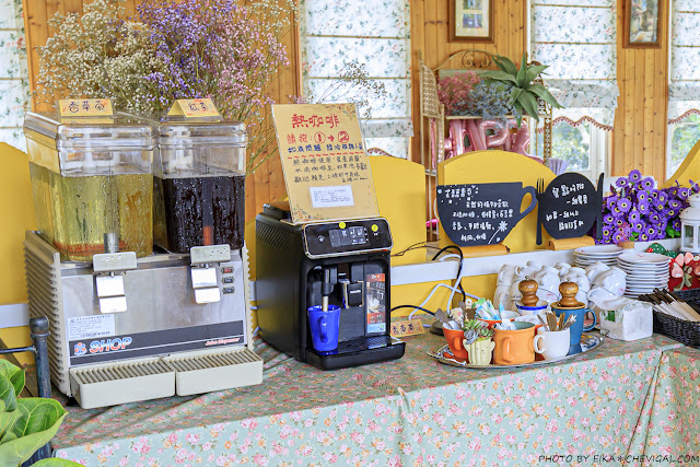 普羅旺斯庭園餐廳的用餐模式還蠻彈性的,像是附餐提供的紅茶、無糖花草茶與義式咖啡,全部都能來自助區盡情取用。無糖花草茶的種類也會不定時調整,像這天喝到的芳香萬壽菊就還蠻清爽的~