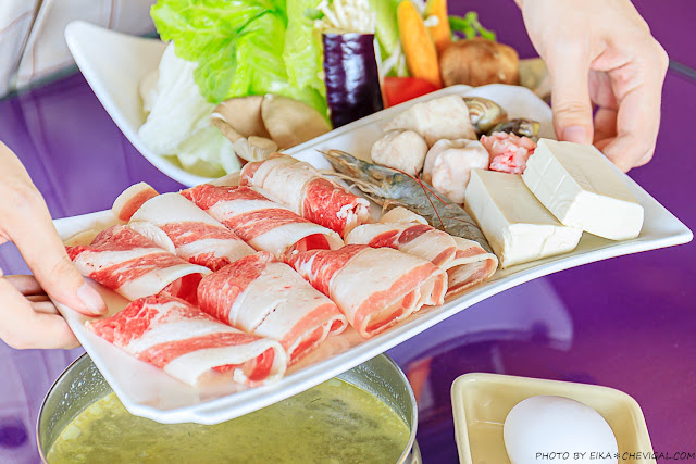 紅椒檸檬香茅鍋的肉片可以選擇搭配豬肉或牛肉,我們這天選擇的是牛肉,整份肉片還包含了小白蝦、蛤蜊、豆腐、芋頭與多種丸子,營養的雞蛋當然也不能少~