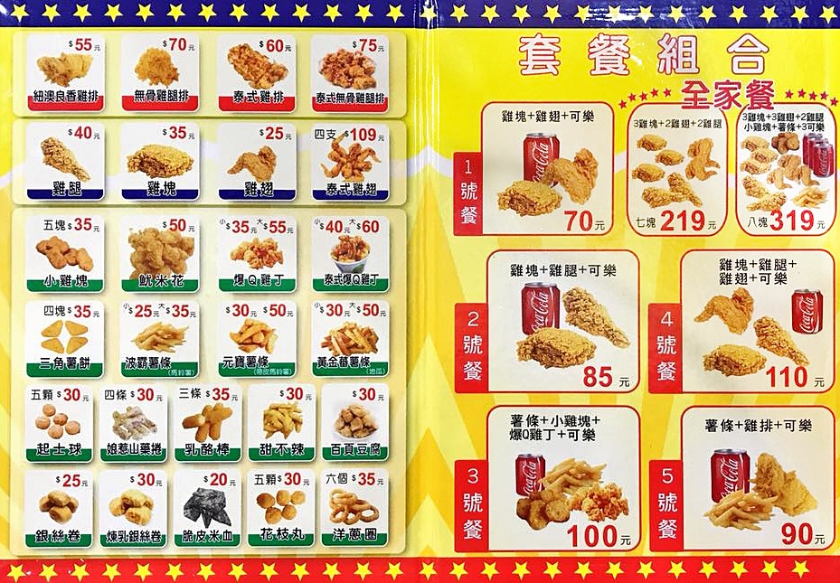 這裡提供爆Q美式炸雞的菜單給你們參考,光是單點的品項就超過25種!像我們一樣有選擇障礙的朋友,可以參考右邊搭配好的套餐與全家餐組合~