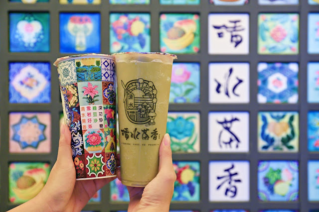 拿到飲料當然要來和花磚牆面合照一下XD 不過要特別留意的是,只有單茶類才是使用復古花磚杯,如果是綠豆沙或有加料的品項則是使用印有LOGO的透明杯,怕點錯的話可以事先和店家確認看看。