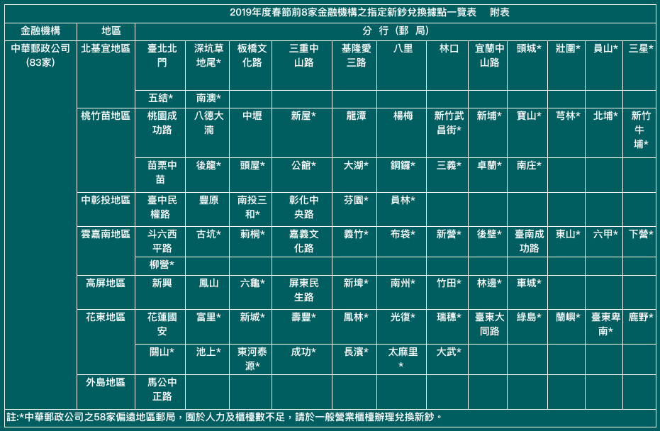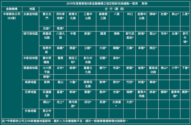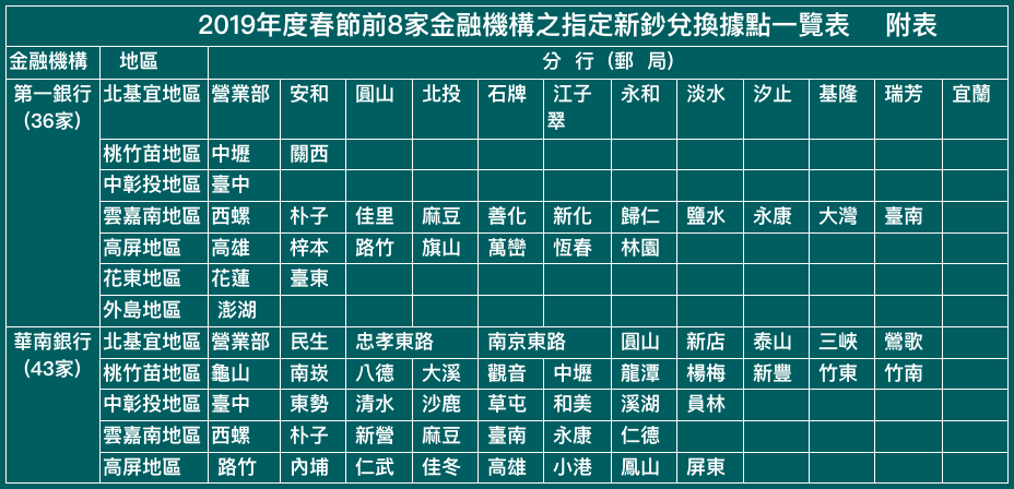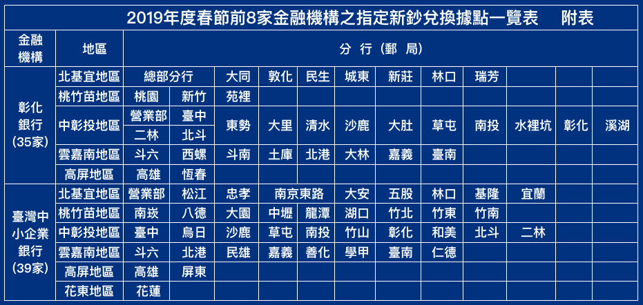 中央銀行表示今年新鈔兌換日程訂於2019/01/28(週一)至2019/02/01(週五),共計連續5個營業日。上述期間,7家銀行之370家指定兌鈔分行,以及中華郵政公司位於都會區之25家指定兌鈔郵局,皆會獨立開設「新鈔兌換專櫃」,另外58家偏遠地區郵局,則於一般營業櫃檯辦理兌換新鈔。(備註:100元新鈔每人限兌100張,其餘各面額鈔券酌量供應。)