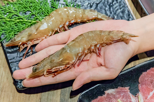 店家提醒我們菜盤可以更換為肉品或是海鮮,有鑑於之前魚編曾經把菜盤換成肉品之後,和朋友都飽到快走不出店外……所以我們這次很有節制地選了遠洋蝦,大隻也很新鮮,肉質還蠻Q彈的。