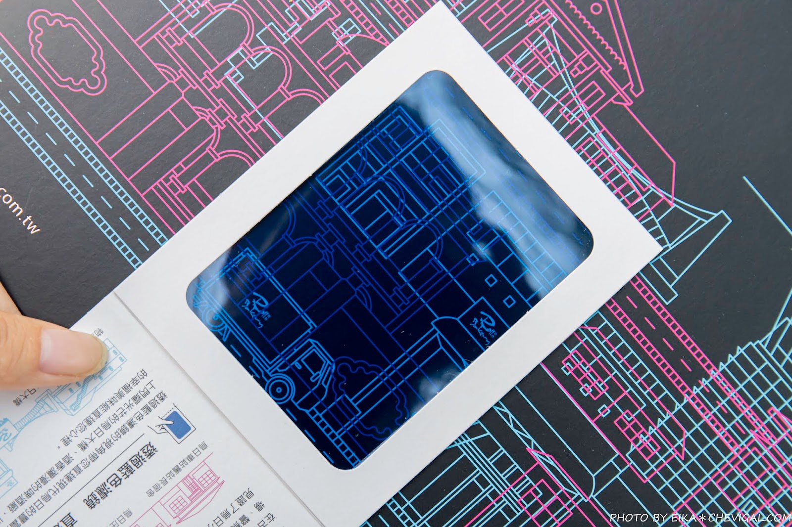盒內附有紅、藍兩色濾鏡卡,透過濾鏡卡可以清楚看到外盒上描繪的烏日建築,分別是烏日獨有的古典與當代建築。