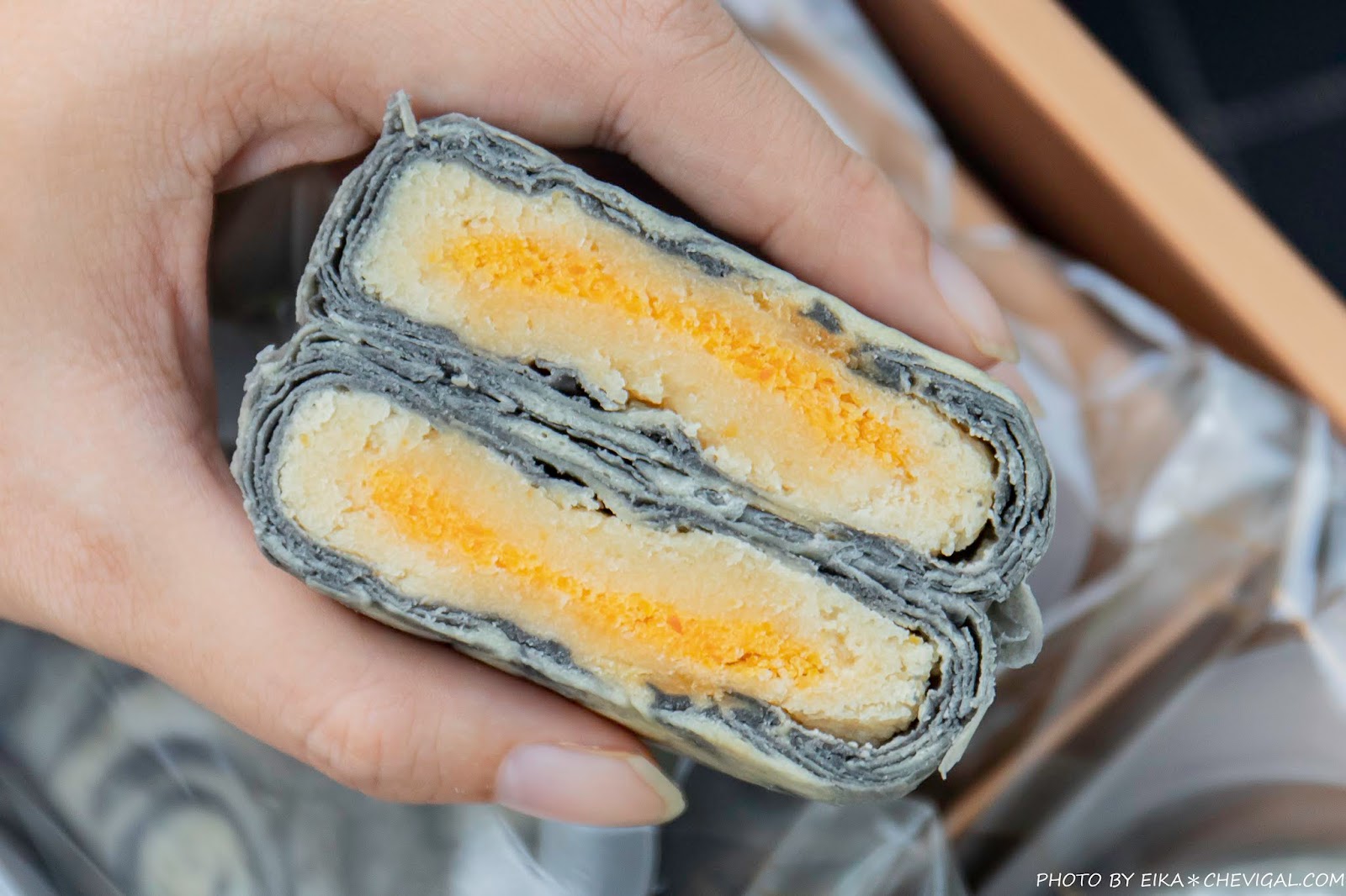 酥餅內餡含有白鳳豆沙、鹹蛋黃與起司,外皮的黑色是竹炭,豆沙的甜味與鹹蛋黃的淡香很明顯,雖然甜度稍高一些,不過配上熱茶或咖啡都很剛好,非常適合當作午後茶點,就連家中的長輩都意外的尬意呢!