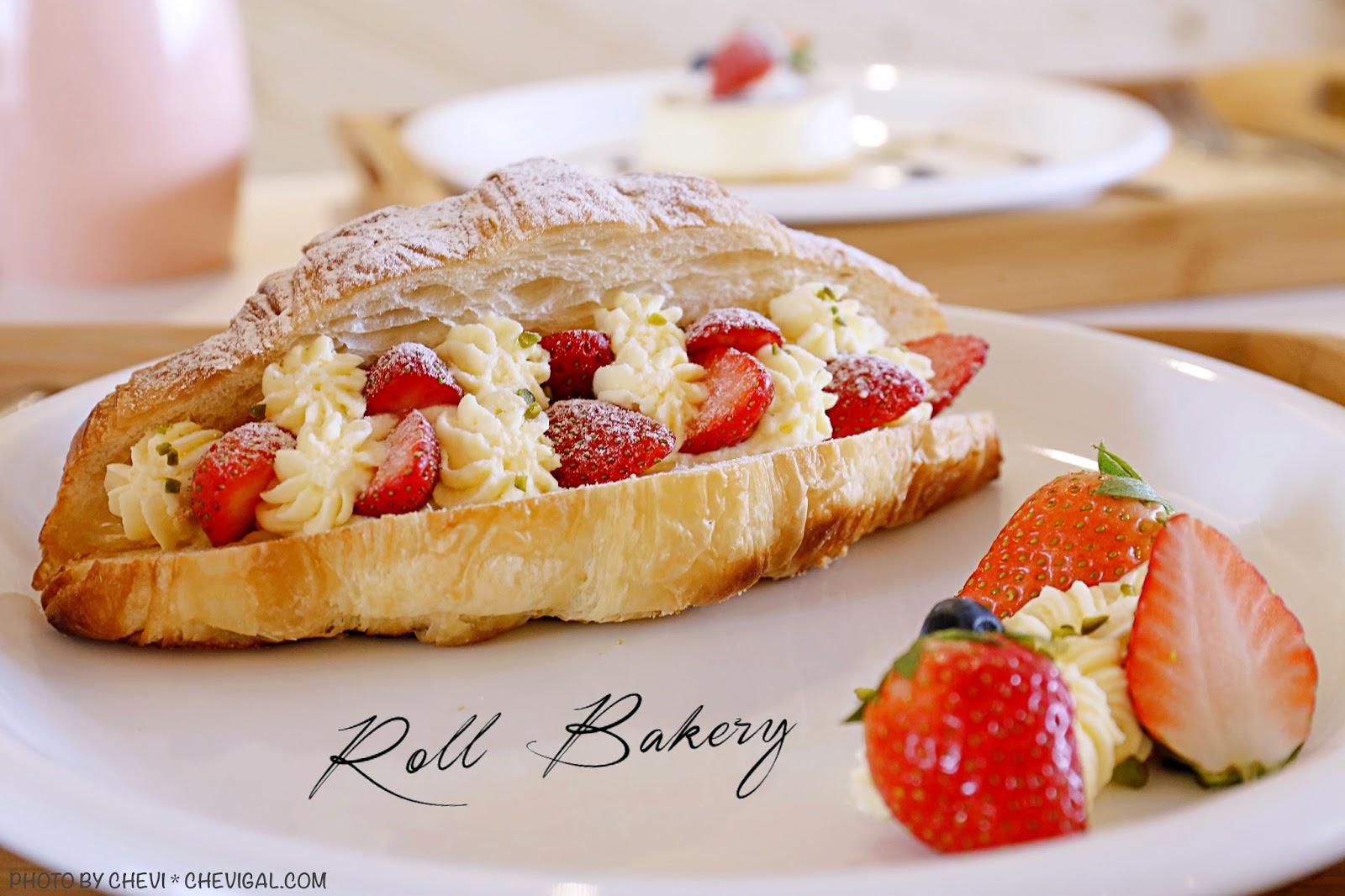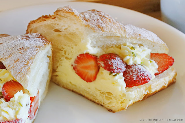 香酥鬆軟且帶有咬勁的可頌麵包體,搭配清爽卡士達醬與酸甜草莓切片,以簡單的下午茶來說,算是蠻有飽足感的份量!