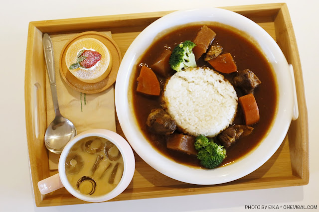 柚柚這天點的是和風牛腩搭配白飯,飲品升級為鐵觀音拿鐵,套餐裡頭還會另外附贈一份甜點~我們還是第一次在甜點店裡吃到咖哩飯,真的很新奇!