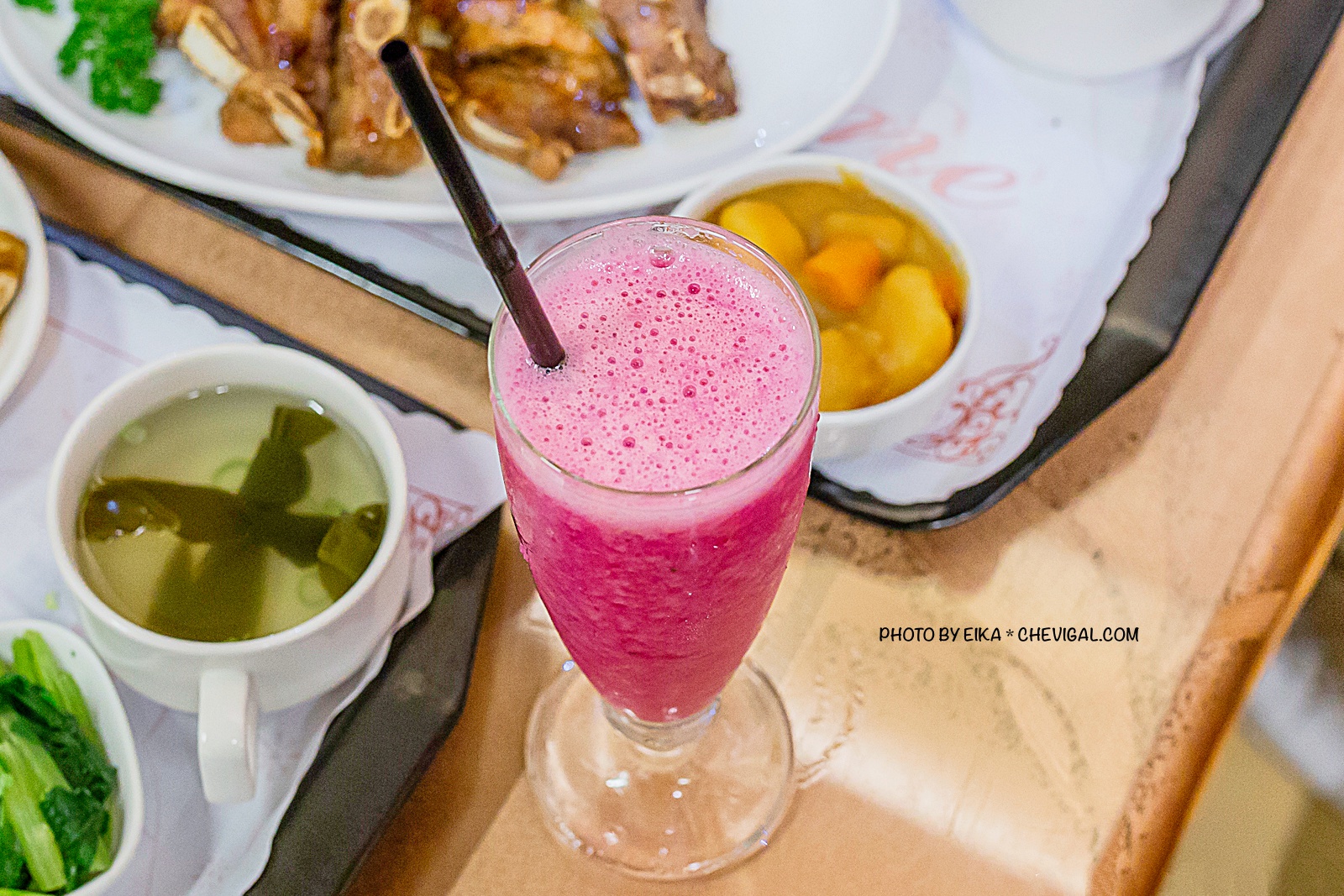 附餐飲品有咖啡、紅茶與現打果汁可以選擇,真心推荐你們可以直接選擇果汁~這天供應的是紅龍果芭樂汁,口感相當濃郁,甚至接近果泥的狀態,光是單點一杯就要120元,難怪當天幾乎每桌都點這杯啊!