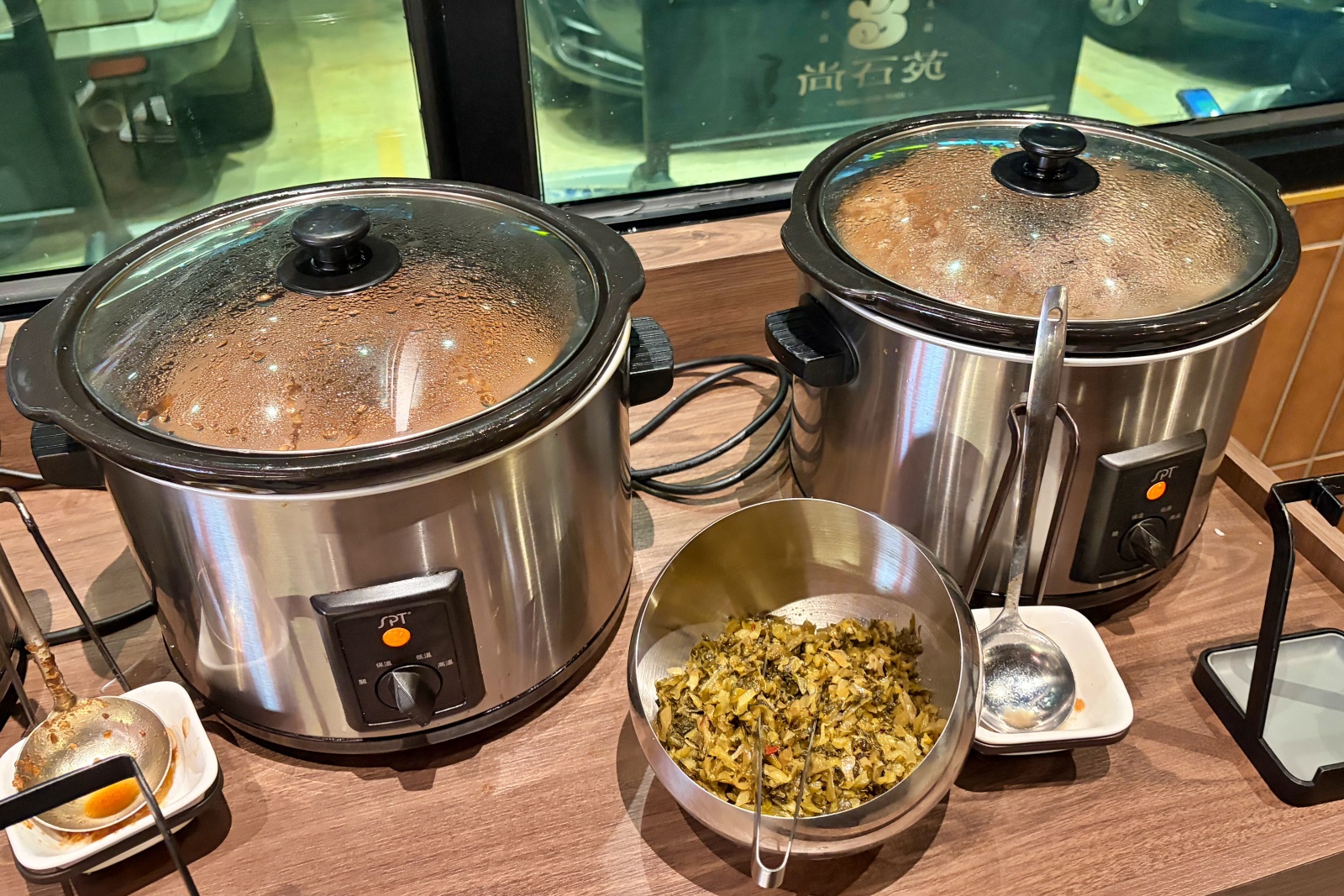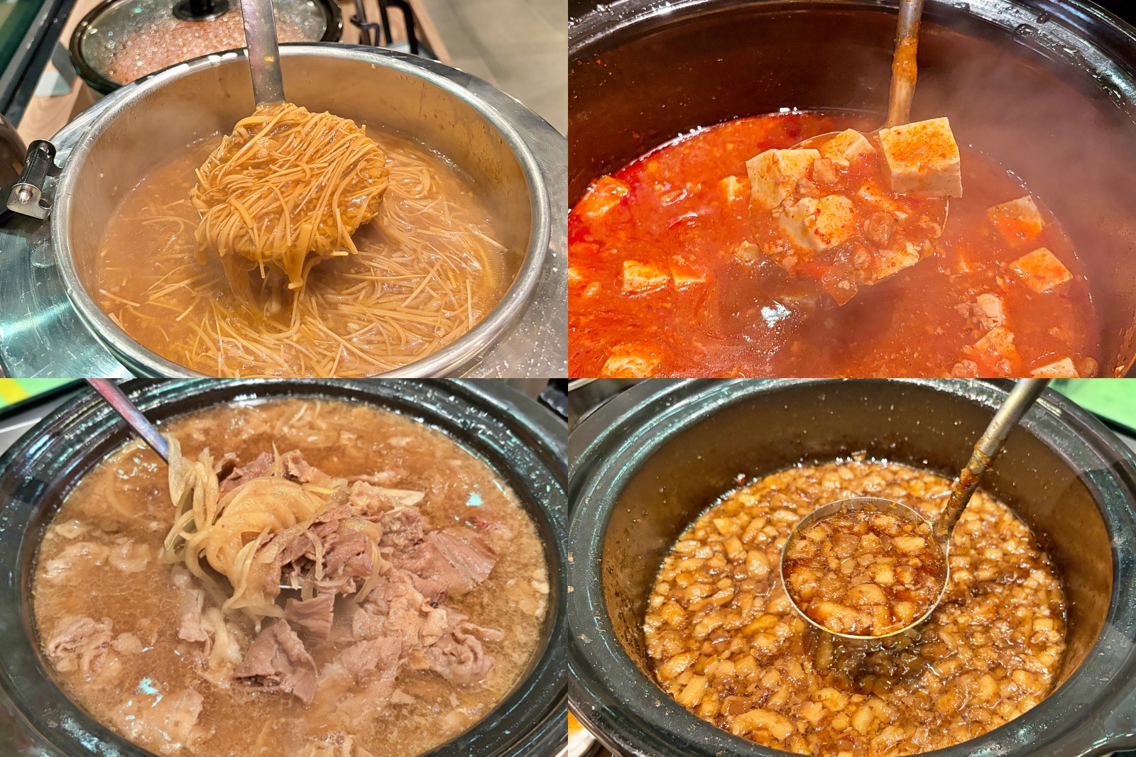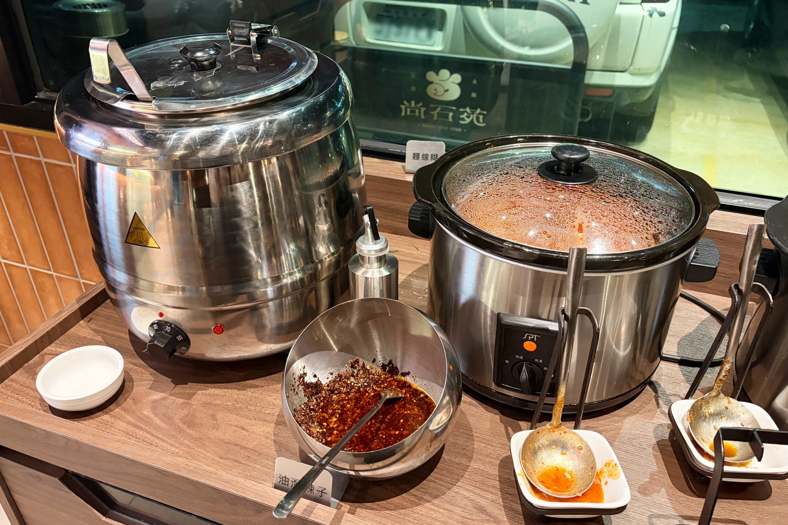 尚石苑的自助吧不是只有蔬菜跟火鍋料,竟然還有古早味麵線糊、台式滷肉飯、牛肉丼與麻辣豆腐,甚至還有提供油潑辣子與酸菜可以搭配。